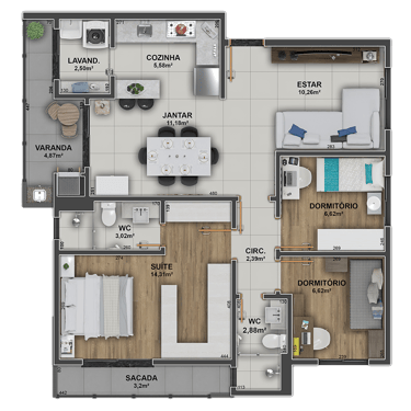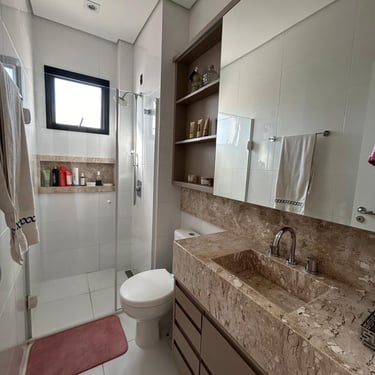 Mais Detalhes: Venezianas integradas automatizadas nas janelas dos dormitórios, tomadas com ponto USB nos quartos, pisos laminados nos dormitórios e em porcelanato polido nos demais cômodos. Todos os ambientes possuem detalhes/acabamentos em gesso e iluminação (plafons, lustres/luminárias, iluminação indireta etc.). Sacada com churrasqueira na sala, e sacadas na suíte e área de serviço. Sistema de aquecimento de água à gás nas torneiras e duchas. Fechadura na porta de acesso ao apartamento eletrônica com senha e biometria. Cozinha conceito aberto, area de serviço independente. Infra-estrutura para ar-condicionado na sala e nos quartos. Apartamento face norte com incidência do sol da manhã e da tarde.
