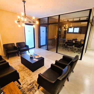 Edifício com hall de entrada decorado, escritório e sala de reuniões compartilhado (conceito Coworking).