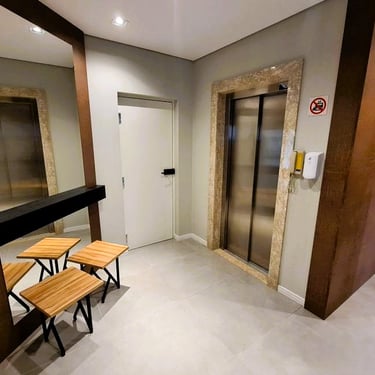 Portaria com segurança e monitoramento por câmeras, elevador social.