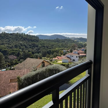 Todas as suítes possuem porta-janelas com linda vista para as montanhas que compõem a Serra da Mantiqueira.