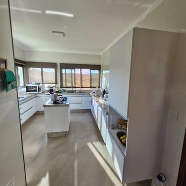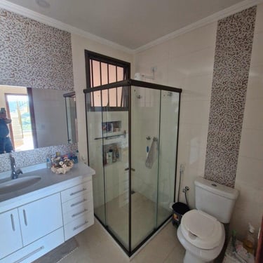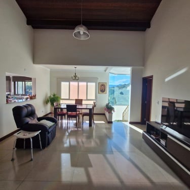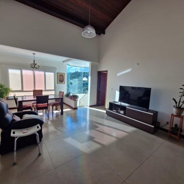 A residência é distribuída no pavimento superior térreo em uma ampla sala em dois ambientes com cozinha padrão em conceito aberto. Com linda vista para as montanhas da Mantiqueira. Sendo 3 quartos, um deles uma ampla suíte, banheiro social, hall e lavanderia com bwc de serviço. Um linda escada que contempla a vista por uma parede de vidro dá acesso ao segundo pavimento no andar inferior, que é distribuído em ampla sala com 2 ambientes, hall, 2 quartos, banheiro social, cozinha, área de serviço e bwc de serviço. Totalizando 5 quartos, e 5 banheiros incluindo bwcs de serviço. Ambos pavimentos possuem acesso a garagem, salão com churrasqueira e ao quintal.