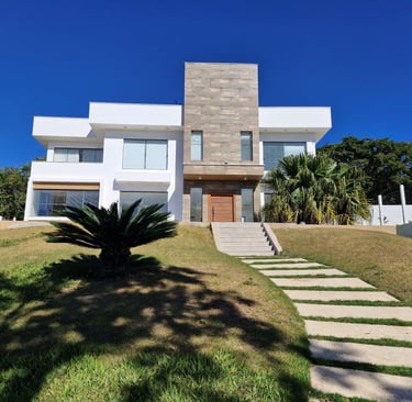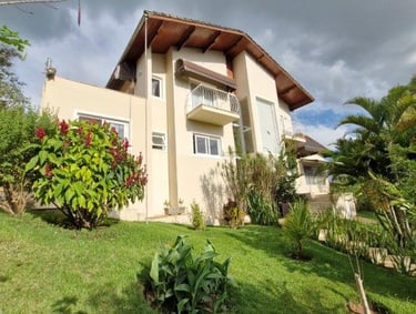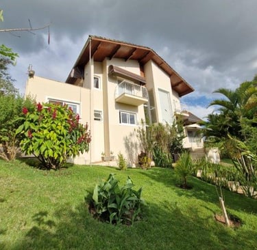 A casa é distribuída em ampla sala em 2 ambientes com lareira e pé direito duplo, varanda com vista para as montanhas. Lavabo, cozinha planejada em conceito aberto, sala de jantar, home-office. Lavanderia com banheiro de serviço. Com um pequeno lance de escada, temos uma ampla suíte master com closet, e sacada com vista deslumbrante. Há também dois quartos avarandados no andar inferior, sendo um deles suíte. A garagem é coberta para 2 veículos, com espaço para estacionar mais veículos. Possuindo amplo depósito (storage).
