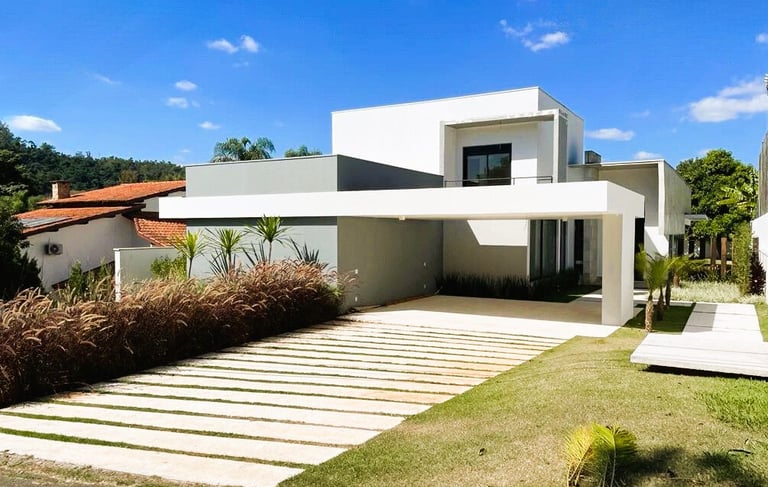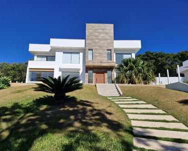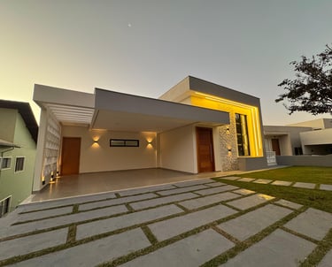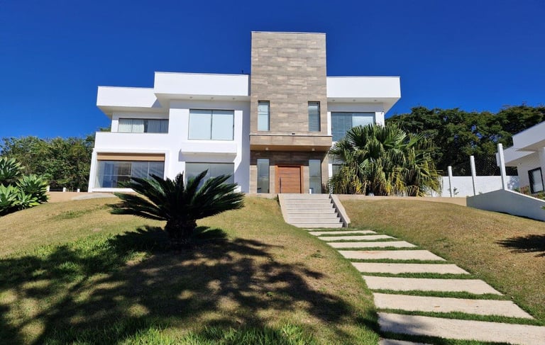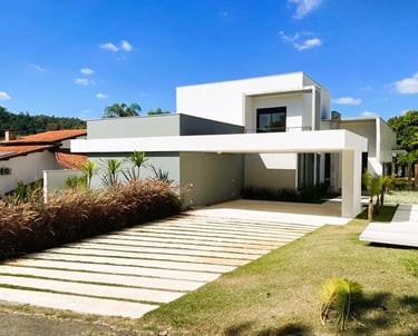 Residência com conceito moderno e aproximadamente 420m² de área construída num terreno com 1000m² privativos. Possui dois andares e 4 suítes. Sendo todas com closet. Imóvel com belissima jardinagem e amplo quintal num condomínio com bastate área vede.