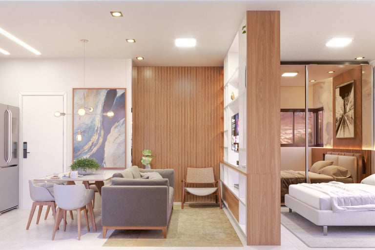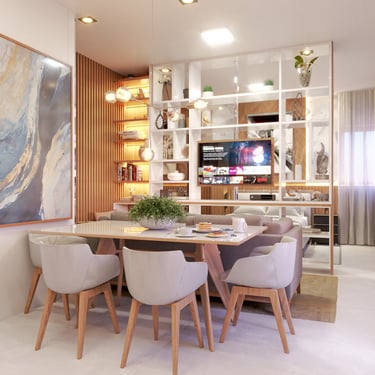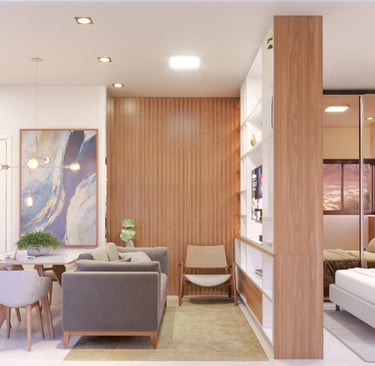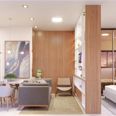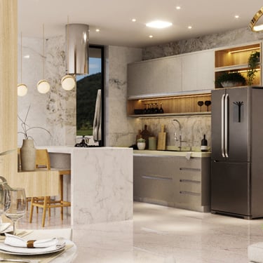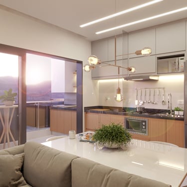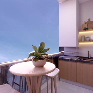 Integrated living room, pantry and kitchen, in an open concept, gourmet balcony.