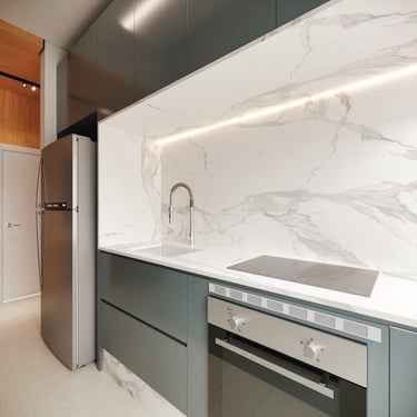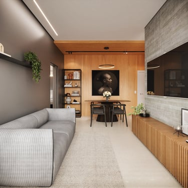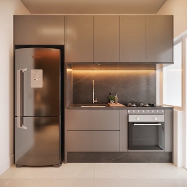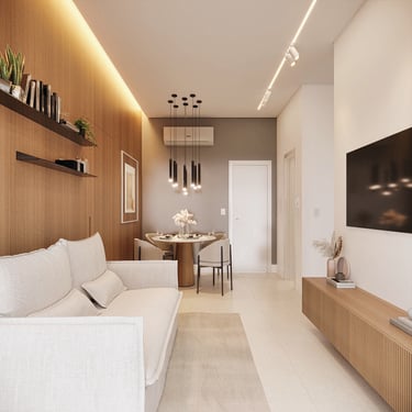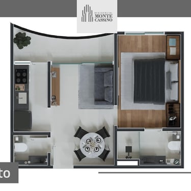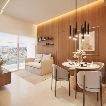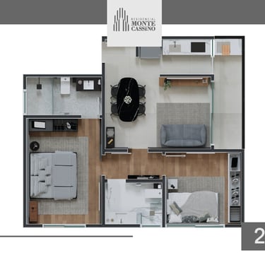 Sala de estar, jantar e cozinha integradas, em conceito aberto, 1 quarto, bwc social, 1 suíte, sacada, AS, e uma vaga de garagem. 62,4 à 63,5m² de área privativa da unidade