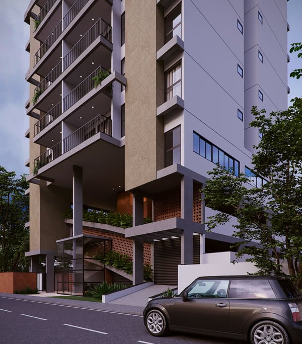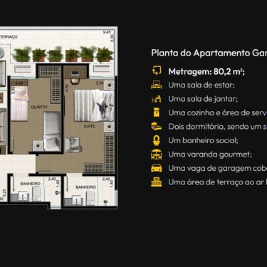 Agora, em relação ao apartamento em si, ele possui dois quartos, sendo uma suíte, varanda com churrasqueira, vaga de garagem privativa e coberta. Há quatro opções de plantas, incluindo 2 opções de apartamento Garden.
