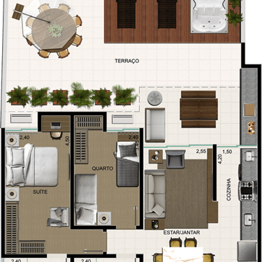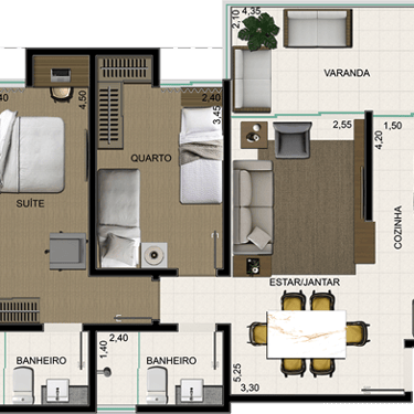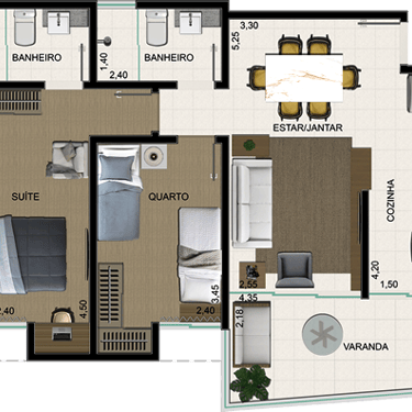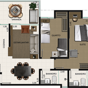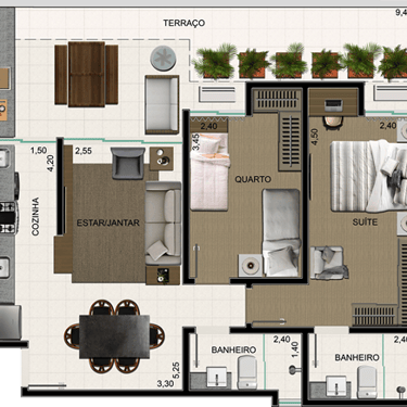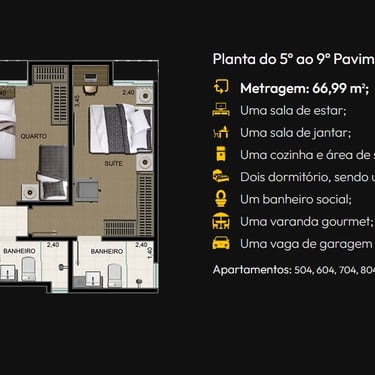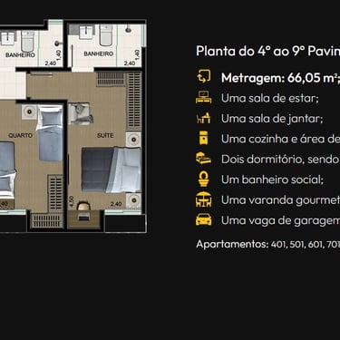 Todos os apartamentos são 2 quartos, sendo uma suíte
