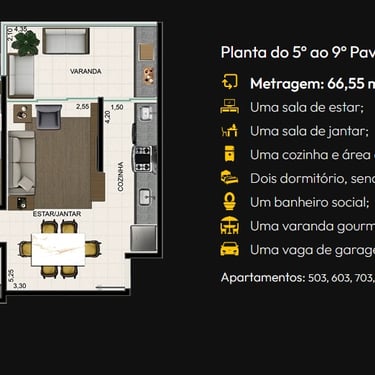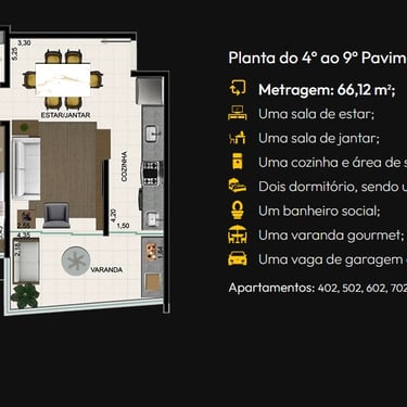Sala de estar/tv, Jantar e Cozinha Integradas, em Conceito Aberto, Sacada Gourmet e garagem coberta e privativa. As plantas variam entre 66m² a 114m².