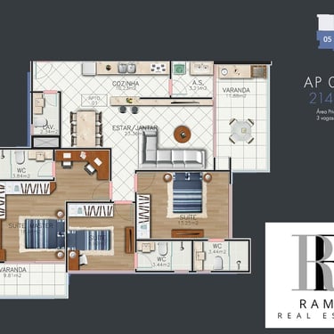 Sala de estar/tv, Jantar e Cozinha Integradas, em Conceito Aberto, Sacada Gourmet com churrasqueira, lavabo, Suíte master com closet ou opção de home-office, e sacada; area de serviço e 2 vagas de garagem coberta e privativa. 214m² de área total, sendo 127m² de área privativa do apartamento.