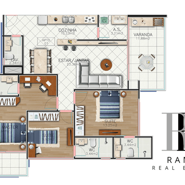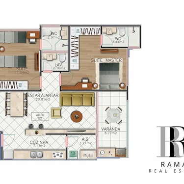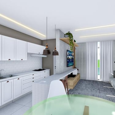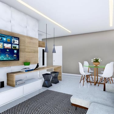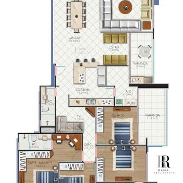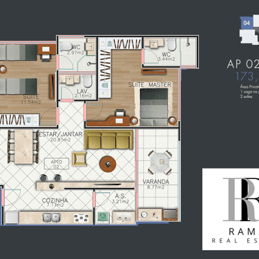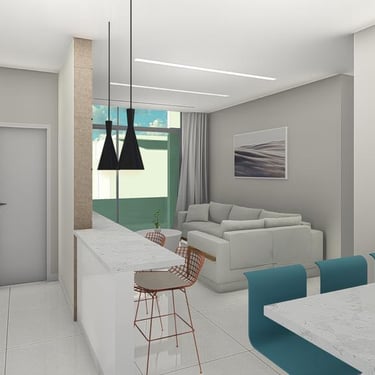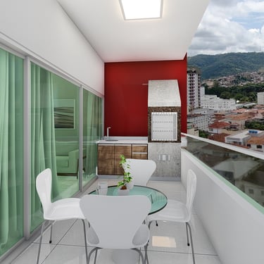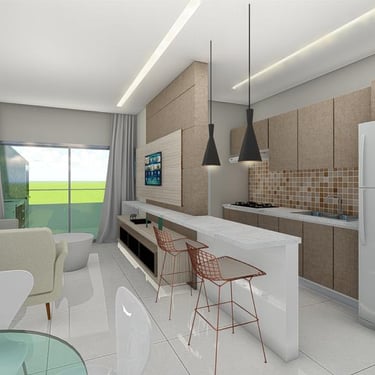 Sala de estar/tv, Jantar e Cozinha Integradas, em Conceito Aberto, Sacada Gourmet com churrasqueira, lavabo, area de serviço e garagem coberta e privativa. 173 à 187m² de área total, sendo 85,6 à 99,3m² de área privativa do apartamento.